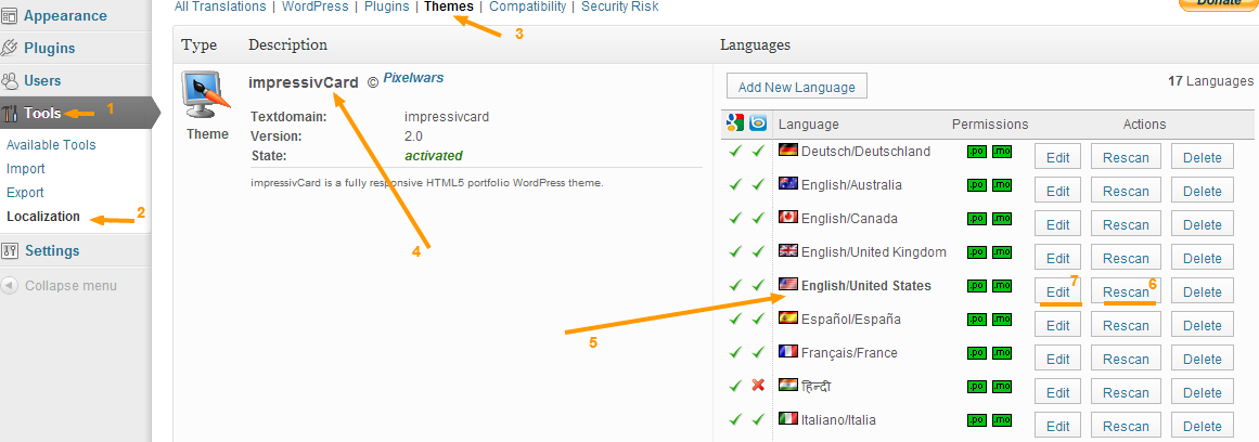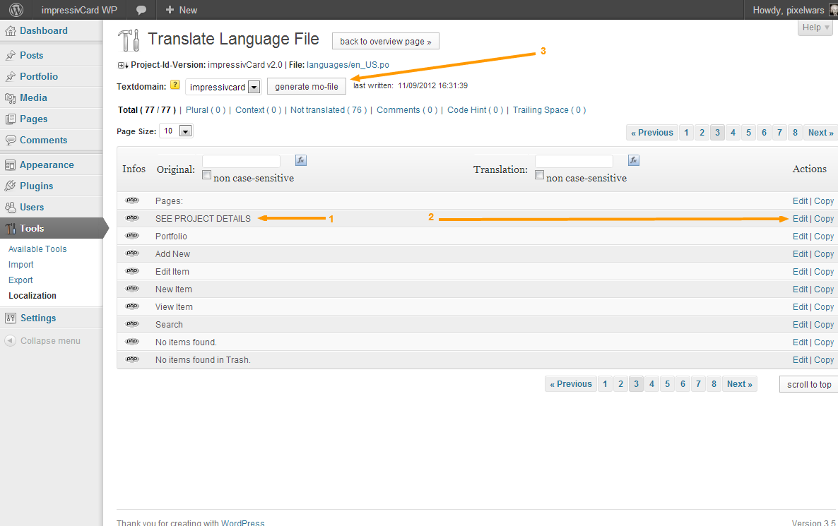 Portfolio Page Posted in : impressivCard WP joseph.pierreParticipant 17 January 2013 at 15:32 #3079 Am I able to change the ‘See Project Details’ to say something else? Thanks. Mehmet S.Keymaster 17 January 2013 at 15:35 #3080 Please see: Documentation > Localization. joseph.pierreParticipant 17 January 2013 at 15:57 #3081 I’ve downloaded the code styling plugin, however, I’m relatively new to wordpress and unable to figure out the specifics. Are you able to provide anymore information that might help. Mehmet S.Keymaster 17 January 2013 at 16:17 #3082 Work step by step as numbered for each image. – Make sure you have right plugin (check plugin name and plugin author name), – Find your own language from the flag list, – Click rescan button and do it, – Then click edit button to go translating page, – Find your phrase end translate it what you want, – Finally click generate mo-file button. joseph.pierreParticipant 19 January 2013 at 02:46 #3142 Thank you for your help. I successfully changed it. :) I have another question regarding the Portfolio Page: If I’ve only got three ‘projects’ displayed, am I able to centre them on the page as opposed to having them aligned to the left? Thanks. ahmetsaliKeymaster 21 January 2013 at 15:29 #3154 Hi, sorry, portfolio filtering script only allows items to be aligned left. Viewing 6 posts - 1 through 6 (of 6 total) The forum ‘impressivCard WP’ is closed to new topics and replies.